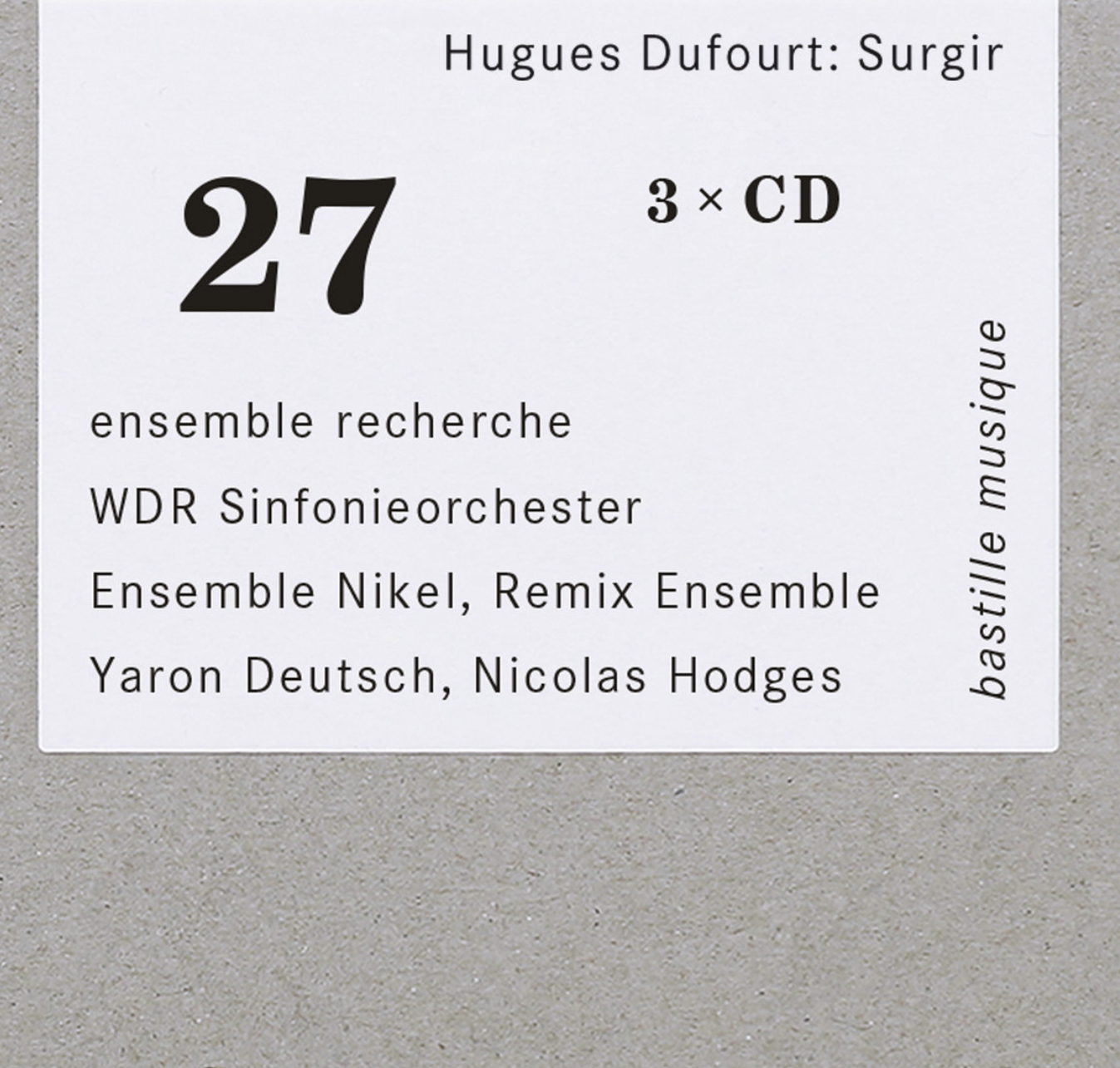 bastille musique presents its twenty-seventh release »Hugues Dufourt: Surgir« featuring world premiere recordings by ensemble recherche, WDR Sinfonieorchester, Ensemble Nikel, Remix Ensemble, Yaron Deutsch (electric guitar) and Nicolas Hodges (piano). Produced by the WDR, the recordings comprise Dufourt’s complete Tiepolo cycle (2004-2016), selected works for orchestra and piano (1980-2012) as well as all compositions for and with electric guitar (1986-2022). Additionally, the box set includes an 80-page trilingual booklet (EN, FR, DE) with articles by Martin Kaltenecker, Harry Vogt and an interview with the composer, several autograph pages as well as two concertina-fold inserts featuring photos of the composer and the performers during the recordings.